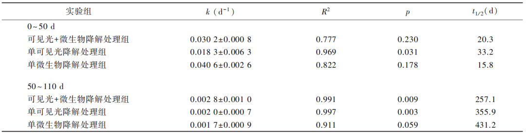 随后根据110d内各处理组的剩余残体量计算残体k和t1/2值(见下表)。前50d内,单微生物降解处理组的k和t1/2值高于单可见光降解处理组和可见光+微生物降解处理组。第110d,可见光+微生物降解处理组的k和t1/2值明显升高,且k值高于单可见光降解处理组和单微生物降解处理组。