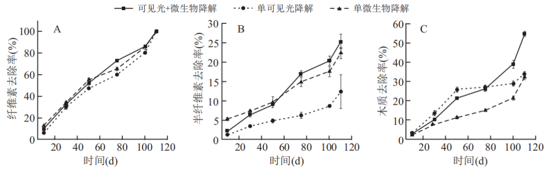 结果表明,不同降解条件下,纤维素、半纤维素和木质素的去除率均随着时间增加而增加,但残体各组分的变化趋势呈现差异性。纤维素降解效率*高,实验结束时(110d),各处理组的纤维素几乎完全被去除(>99%),并且各个处理组间并无显著性差异。前50d内,单可见光组降解处理组的半纤维素的去除效率显著低于单微生物处理组和可见光+微生物降解处理组。第50d开始可见光+微生物降解组的半纤维素去除率逐渐大于单可见光处理组和单微生物处理组。110d时,可见光+微生物降解处理组、单可见光处理组和单微生物处理组的去除率分别达到25.3±1.9%、12.33±4.4%和22.3±1.5%。
