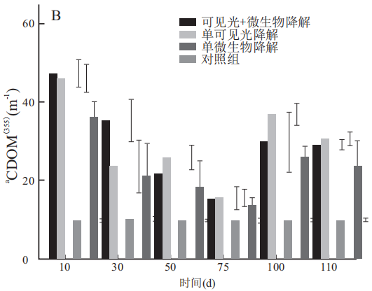 DOC和CDOM的过程分析植物残体降解过程中DOC浓度随时间的变化如图所示。实验第10d,单微生物降解处理组的DOC含量(65.46±1.65mg·L-1)显著高于单可见光降解处理组(32.26±2.18mg·L-1)和可见光+微生物降解处理组(43.50mg·L-1)。同时还发现,在实验10d内,对照组也生成DOC(16.2±2.10mg·L-1),这是由于植物残体在水体中浸泡过程中会通过物理作用将DOC组分释放到水体中。随着残体逐渐分解,单微生物降解处理组和可见光+微生物降解处理组的DOC浓度呈下降趋势,*终浓度均低于10mg·L-1。但单可见光降解处理组DOC浓度呈上升趋势,在75d时DOC浓度(48.02±1.51mg·L-1)*高,之后浓度逐渐下降,*终110d时浓度仍达28.51±2.95mg·L-1。