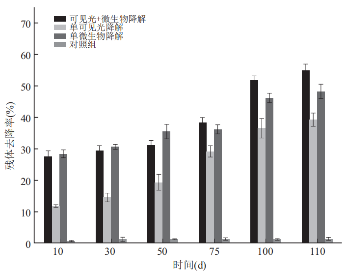 对不同降解条件下植物残体的去除率进行分析,如图所示,在残体降解的前50d内,单微生物降解处理组的残体降解*快,第50d残体去除率达到35.5±2.3%,其次为可见光+微生物降解处理组(31.2±1.5%),降解*慢的处理为单光降解处理组(19.3±2.9%)。然而降解50d后,可见光+微生物降解处理组的降解率逐渐高于单微生物降解处理组和单可见光降解处理组,证明了可见光和微生物联合降解对植物残体的去除过程发挥着重要的作用。实验结束时(110d),可见光+微生物降解处理组、单微生物降解处理组和单可见光降解处理组的残体去除率分别为54.9±2.1%、48.3±2.3%和39.3±2.2%。在整个降解过程中,单可见光降解处理组的降解率显著低于可见光+微生物降解处理组和单微生物降解处理组。另外,对照组的残体质量在实验过程中没有发生显著变化。