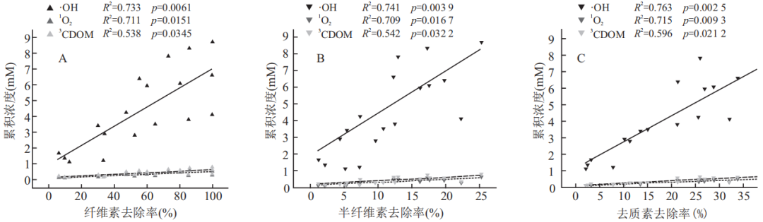 3、与单可见光降解或单微生物降解相比,光和微生物降解联合处理累积产生更多的ROS。进一步统计分析得出累积产生的ROS浓度与不同残体组分尤其是木质素组分的去除率均呈显著正相关关系,其中生成·OH自由基的含量*多,与残体各组分去除率的相关性更强。