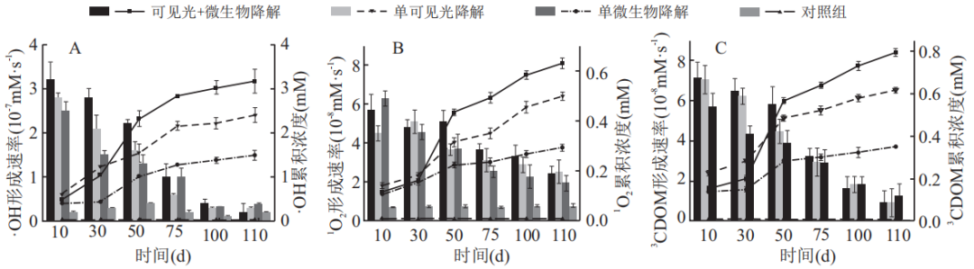 不同处理组下植物残体降解过程中水体的3种ROS(·OH、1O2和3CDOM*)产生速率随时间变化趋势见下图。实验前10d,可见光+微生物降解处理组的ROS形成速率快于单可见光降解处理组。之后,各处理组ROS的形成速率均呈下降趋势。75-110d,不同处理条件下3种ROS的形成速率逐渐相近。在降解的前75d内,·OH的形成速率相对较快。75d后,·OH和1O2的形成速率逐渐相近,均快于3CDOM*,但三者差别较小。