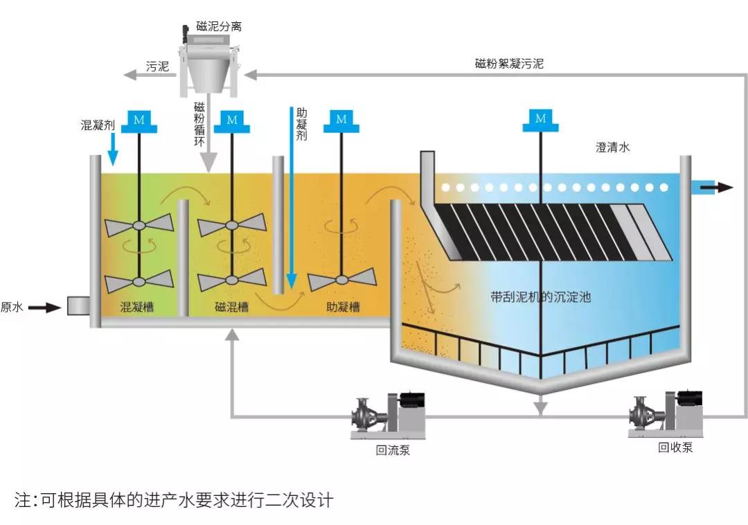 磁沉淀水体净化技术是向原水中投加适量混凝剂、磁种、助凝剂等,使污染物快速絮凝,同时磁种大幅