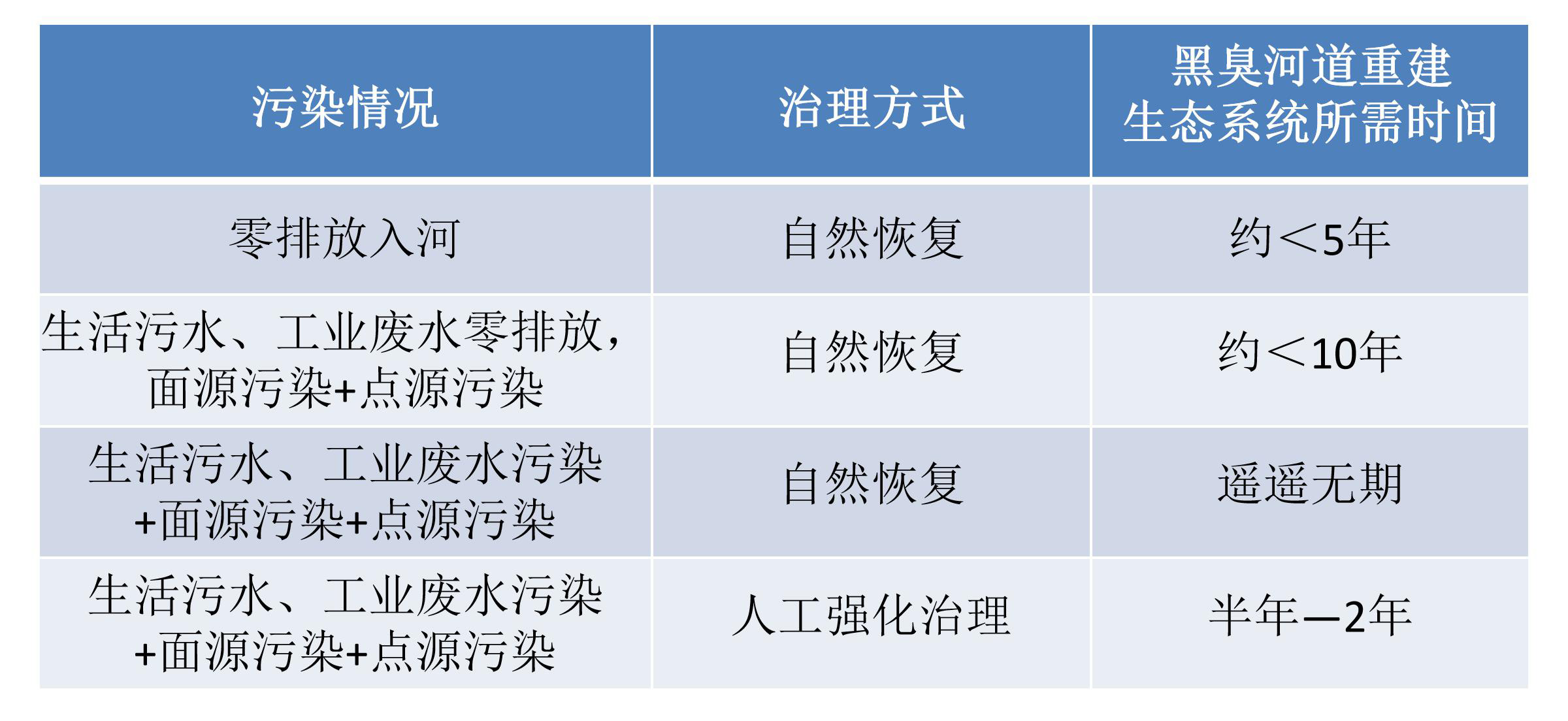 用生态学理论对黑臭河道的生态系统恢复进行分析,针对不同的污染情况,重建生态系统所需的时间各异。